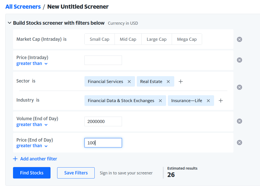Are you referring a stock screener where you can set filters? Like the attached 2 screenshots of Yahoo Finance? I don't trade stock, but would be curious to know how to set up a screener in Sierra. Date Time Of Last Edit: 2022-05-27 15:30:54