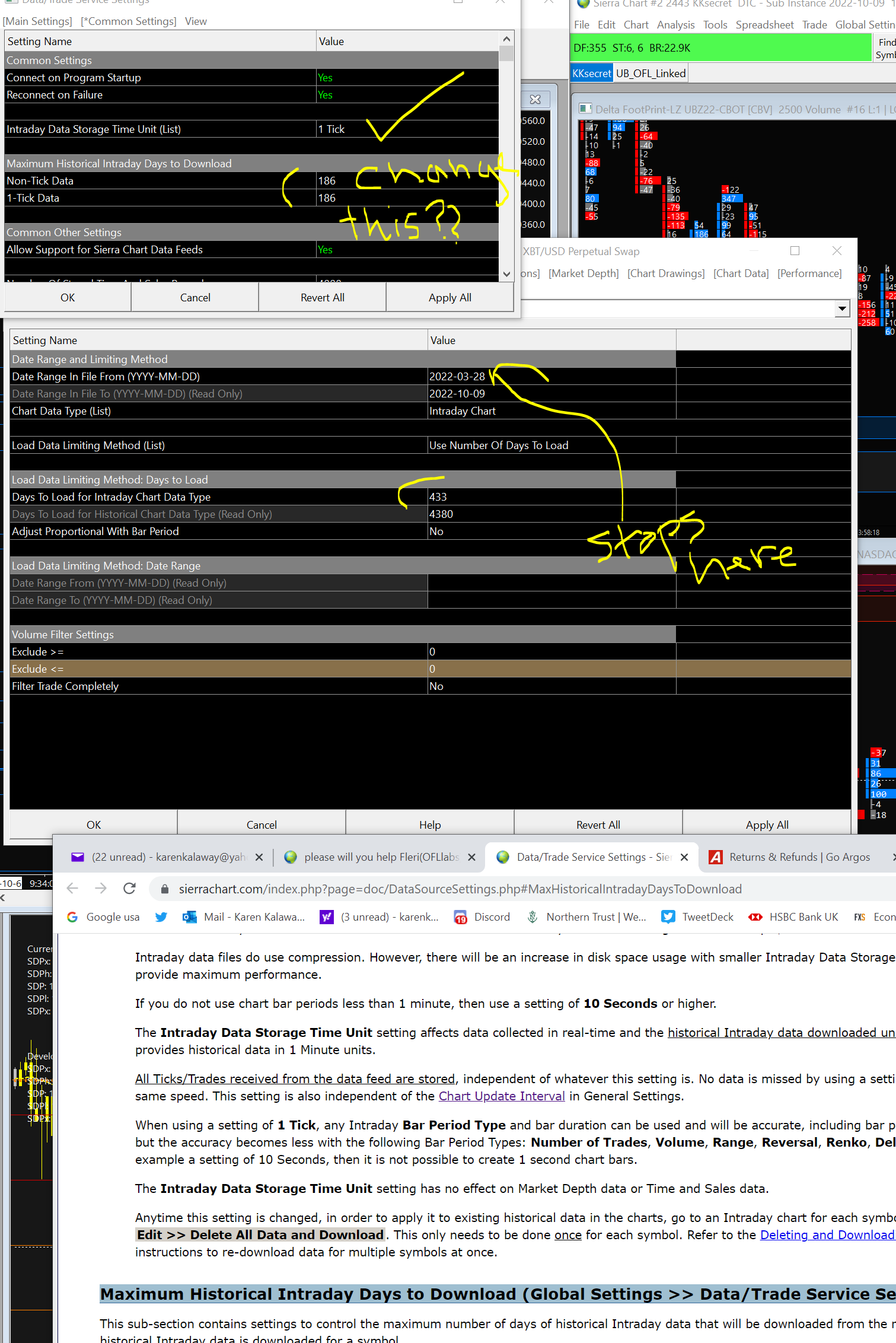 1) Set this (1 Tick Data) to some high number like 730 (2 years) - https://www.sierrachart.com/index.php?page=doc/DataSourceSettings.php#MaxHistoricalIntradayDaysToDownload 2) Open a chart for XBTUSD-BMEX and set days to load to 730 3) Edit - Delete All and Data and Download Like magic, a XBTUSD-BMEX chart with 730 days of intraday data.... |