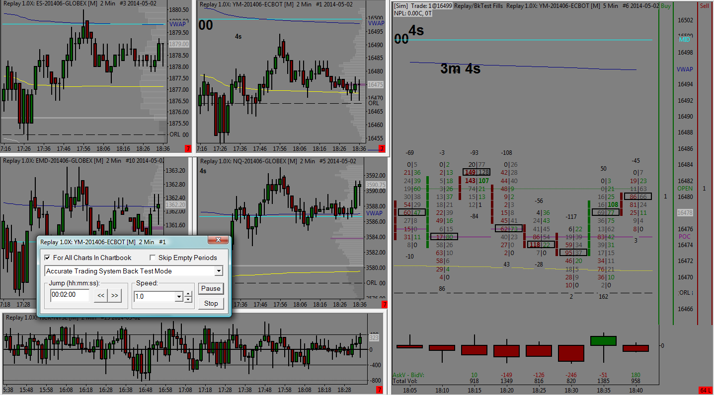Please, have a look at the attached file. There are two charts showing the YM futures contract. The middle upper chart is a 2 minute chart, the numbarsbar is a 5 minute chart. In both charts a countdown timer is implemented. One countdown timer per each chart. Unfortunatelly, the 2minute count down timer is copied onto the 5minute chart and vice versa. Settings> 1132 version / Sierra Chart Data Feed / Interactive Brokers / Chart Replay mode |