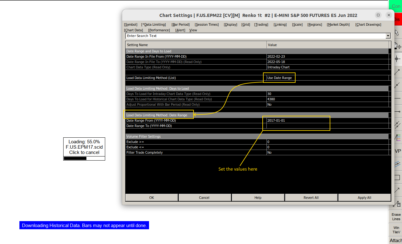 I don't really understand the behavior of this tab: Why if I set Date Range In File From to 2022-02-23 the system start to loading from 2017 as you can see in the attach file? I setup Load data limiting method (list) --> use date range and Date Range and Days to load --> 2022-02-23 Date Time Of Last Edit: 2022-05-31 08:21:12