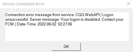 Sierra Chart has no control over this. Refer to number 12 here: CQG Trading Platform Service: Common Error Messages ---- To access historical and streaming market data independent from your Trading service. Follow these instructions. Set "Global Settings >> Data/Trade Service Settings >> Current Selected Service" to "SC Data-All Services". Press "OK" And then translate the symbols in your Chartbooks and Sierra Chart using this "Edit' menu command: Edit Menu: Edit >> Translate Symbols To Current Service (Translate Symbols to Current Service) You can then use the data provided by Sierra Chart independent of your trading service. Sierra Chart Support - Engineering Level Your definitive source for support. Other responses are from users. Try to keep your questions brief and to the point. Be aware of support policy: https://www.sierrachart.com/index.php?l=PostingInformation.php#GeneralInformation For the most reliable, advanced, and zero cost futures order routing, *change* to the Teton service: Sierra Chart Teton Futures Order Routing |