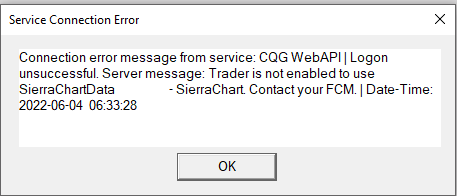 I've attached the screenshot but I get "Connection error message from service: CQG WebAPI|Logon unsuccessful. Server message: Trader is not enabled to use SierraChartData. - SierraChart. Contact your FCM| Date-Time: 2002-06-04 06:33:28" I've been told by NT that they don't support CQG Web API connections any longer. |