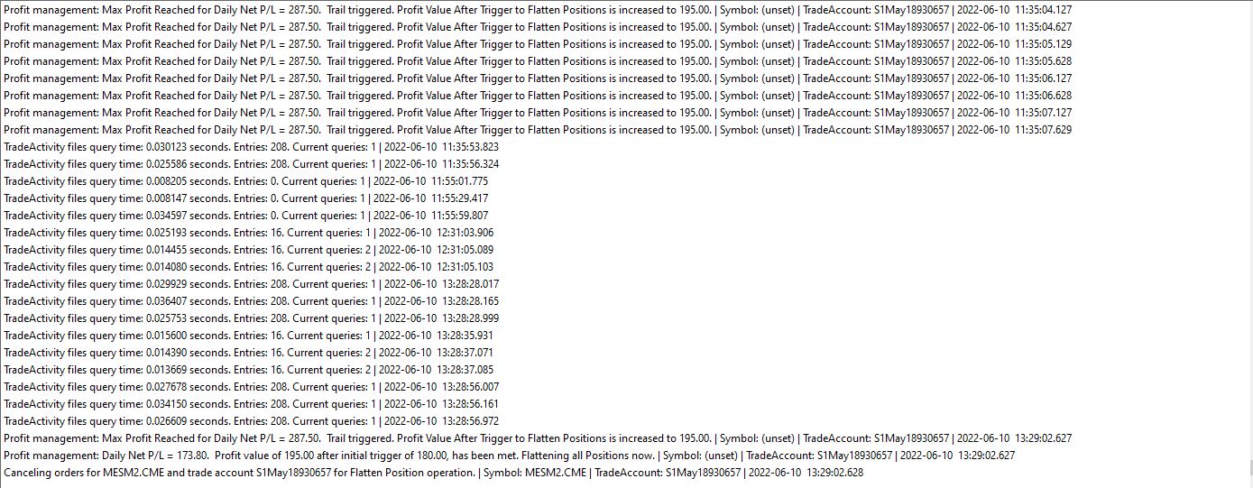 This has nothing to do with the symbols. The issue is that you have setup a Profit Limit in Global Profit/Loss Management, and you are above that profit limit, therefore all new orders are being immediately flattened. You need to change your settings for Global Profit/Loss Management. Refer to the information here: Global Profit/Loss Management For the most reliable, advanced, and zero cost futures order routing, use the Teton service: Sierra Chart Teton Futures Order Routing |