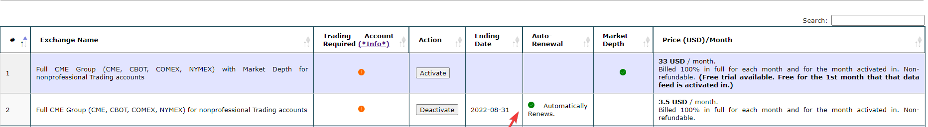 Since you want the Market Depth data, you will want the Full CME Group (CME, CBOT, COMEX, NYMEX) with Market Depth for NonProfessional Trading Accounts. The exchange fees are charged on the first day of each month. We see you Activated and then Deactivated both exchange options. In order to have the exchange you want automatically renew each month, you need to select the Activate button for it. For the most reliable, advanced, and zero cost futures order routing, use the Teton service: Sierra Chart Teton Futures Order Routing |