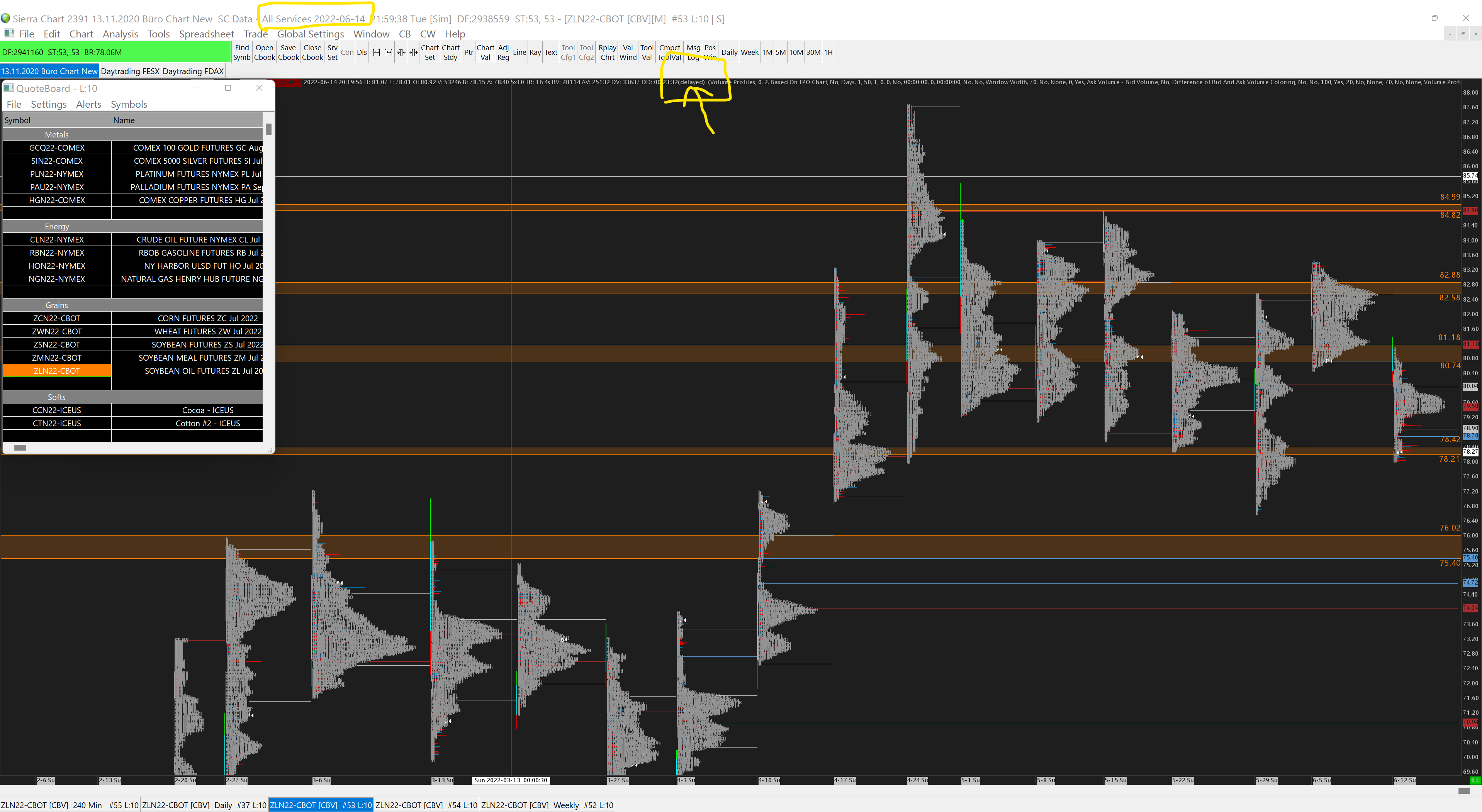In the Volume Profile Weekly, the Value Area High and Low or the Point of Control are displayed incorrectly. The problem is not only with ZL but with almost all grains ZC, ZW, ZS, ZM, and ZL after the market close. When the market is open the data are not delayed. |