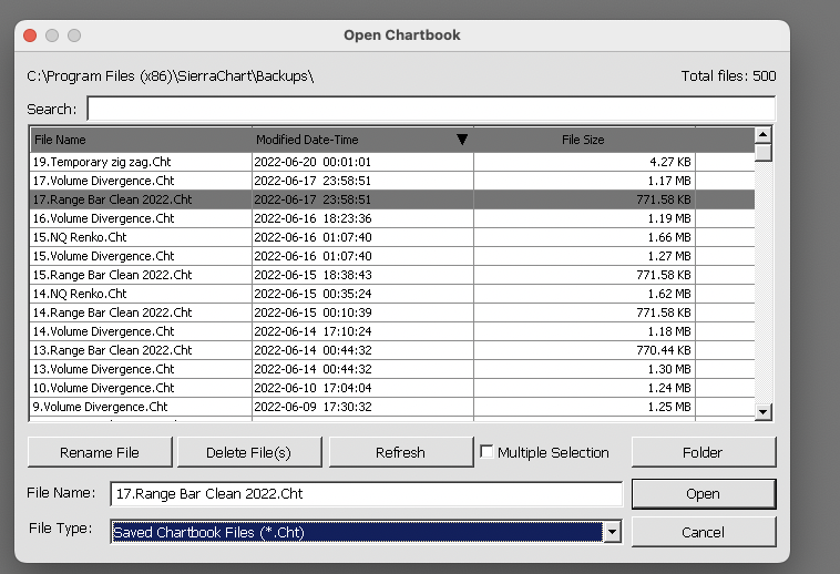 This is the error you are getting: The Chartbook file is not a valid Chartbook. File: C:\Program Files (x86)\SierraChart\Data\Volume Divergence.Cht | 2022-06-19 01:53:22.691 * Refer to: Chartbooks (Workspaces): Opening Older Chartbooks Sierra Chart Support - Engineering Level Your definitive source for support. Other responses are from users. Try to keep your questions brief and to the point. Be aware of support policy: https://www.sierrachart.com/index.php?l=PostingInformation.php#GeneralInformation For the most reliable, advanced, and zero cost futures order routing, *change* to the Teton service: Sierra Chart Teton Futures Order Routing |