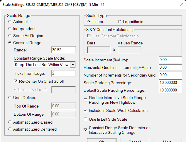 Follow the instructions here for this: Chart Scale and Scale Adjusting: Opening the Scale Settings Window for the Main Price Graph Sierra Chart Support - Engineering Level Your definitive source for support. Other responses are from users. Try to keep your questions brief and to the point. Be aware of support policy: https://www.sierrachart.com/index.php?l=PostingInformation.php#GeneralInformation For the most reliable, advanced, and zero cost futures order routing, *change* to the Teton service: Sierra Chart Teton Futures Order Routing |