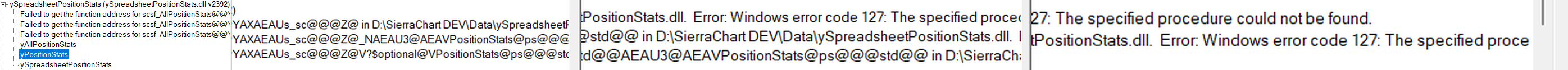 I have noticed some weird functions listed in my Custom Studies DLL. I can say they occur because of Function Types.. see my code image for example I implemented a workaround, it still lists weird (But different) extra "studies" but my code in the real studies (The ones I actually created with scsf_ in my code) work when the workaround is used. When the workaround is not used (i.e. the code is like in the image), they don't and the DLL lists the good studies with error messages like Custom DLL something or other error when trying to add the study to a chart. The workaround is simple. I moved the function typedefs into another new namespace called "wow", I created this namespace just to test this. The sierra screenshot images are scrolling the dialog to the right.. it is not a perfect capture but shows most of the dll function names. The code is most of my header, it is the important code .. all that is missing is a few includes and a few constants. I use VS2022 and target C++20 if that matters at all. Just to be clear.. in the original namespace, I get these extra "studies" and my good studies in the dll will give the "custom dll" error when adding a study to a chart. moving function types to the "wow" namespace, leaves extra "studies" but my good studies in the dll don't display a custom dll error for the study name, instead they show their original study graphnames and their code runs. I call it a worksaround since it still leaves these weird looking extra studies listed in the dll. |