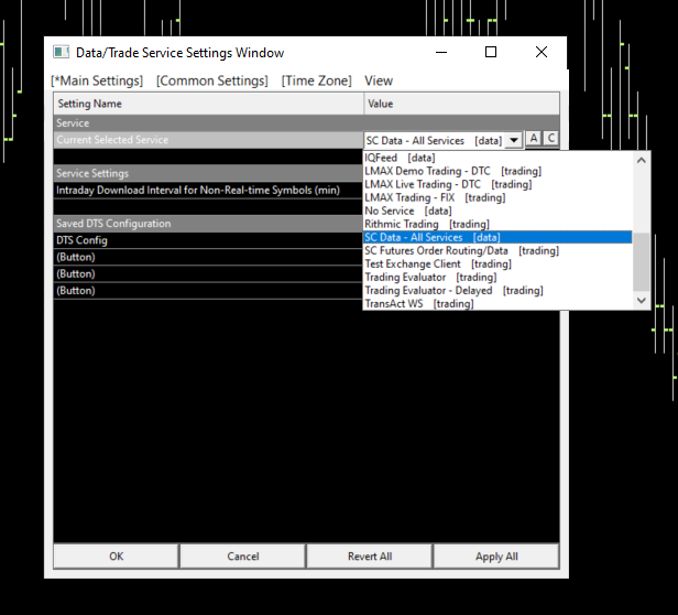 You leave the Current Selected Service alone. It should be set to CQG WebAPI from when you made your connection to CQG. You do not need to change this. The only thing that you might change is the setting for Global Settings >> Data/Trade Service Settings >> Common Settings >> Allow Support for Sierra Chart Data Feeds, which will need to be set to Yes. If you do need to change this, then be sure to select OK to close that window then select File >> Disconnect followed by File >> Connect to Data Feed. Otherwise, just continue through all of the setup instructions and you should be fine. For the most reliable, advanced, and zero cost futures order routing, use the Teton service: Sierra Chart Teton Futures Order Routing |