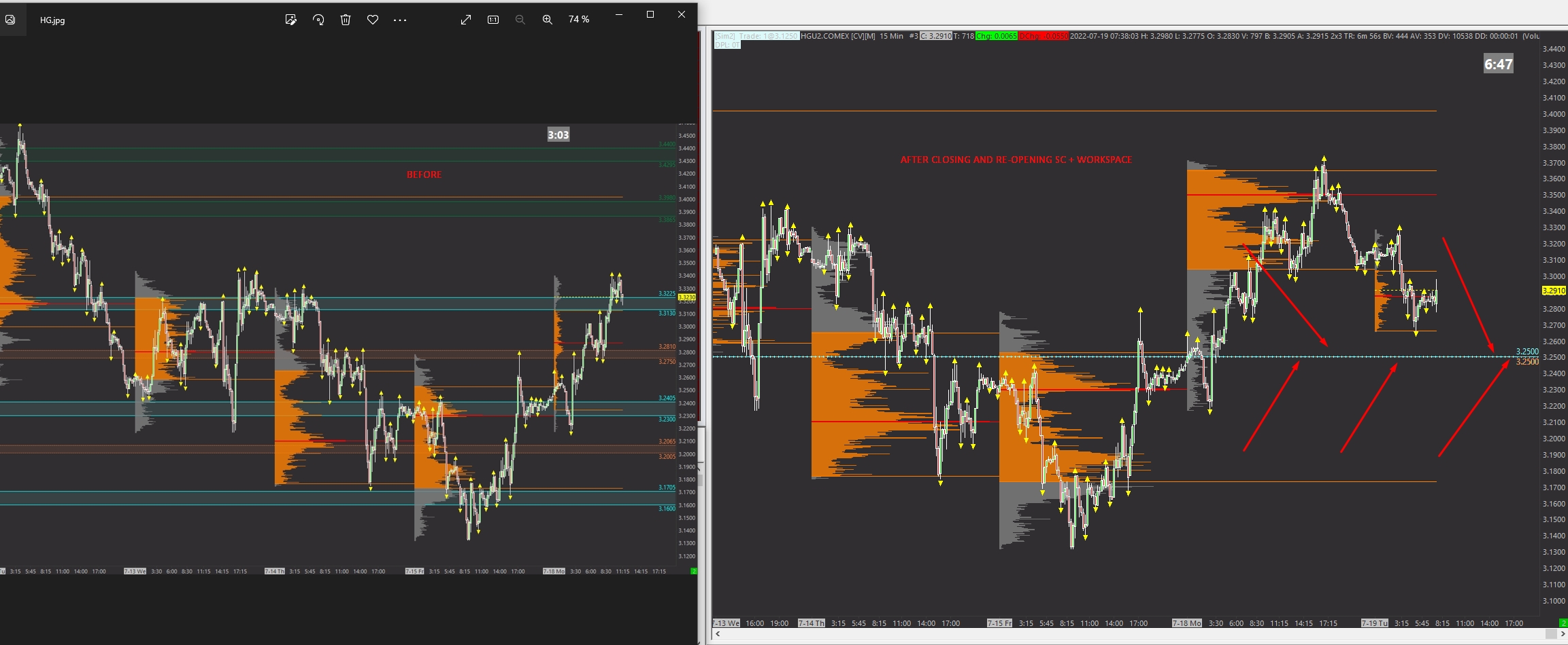 Hi guys, since a couple of days I am experiencing an odd but disturbing problem: - I have a workspace set up for various futures markets and I am toggling btw. them with the QuoteBoard - when I add tools such as lines, rectangles, text etc. and close SC (after saving all) the tools will be there after reopening for all markets (e.g. CL, ES) except for one market, in my case HG - in this one market (HG) the tools are still there but are all condensed and stacked on one single price - I have updated SC to Rev. 2408 but the problem remains What can I do? |