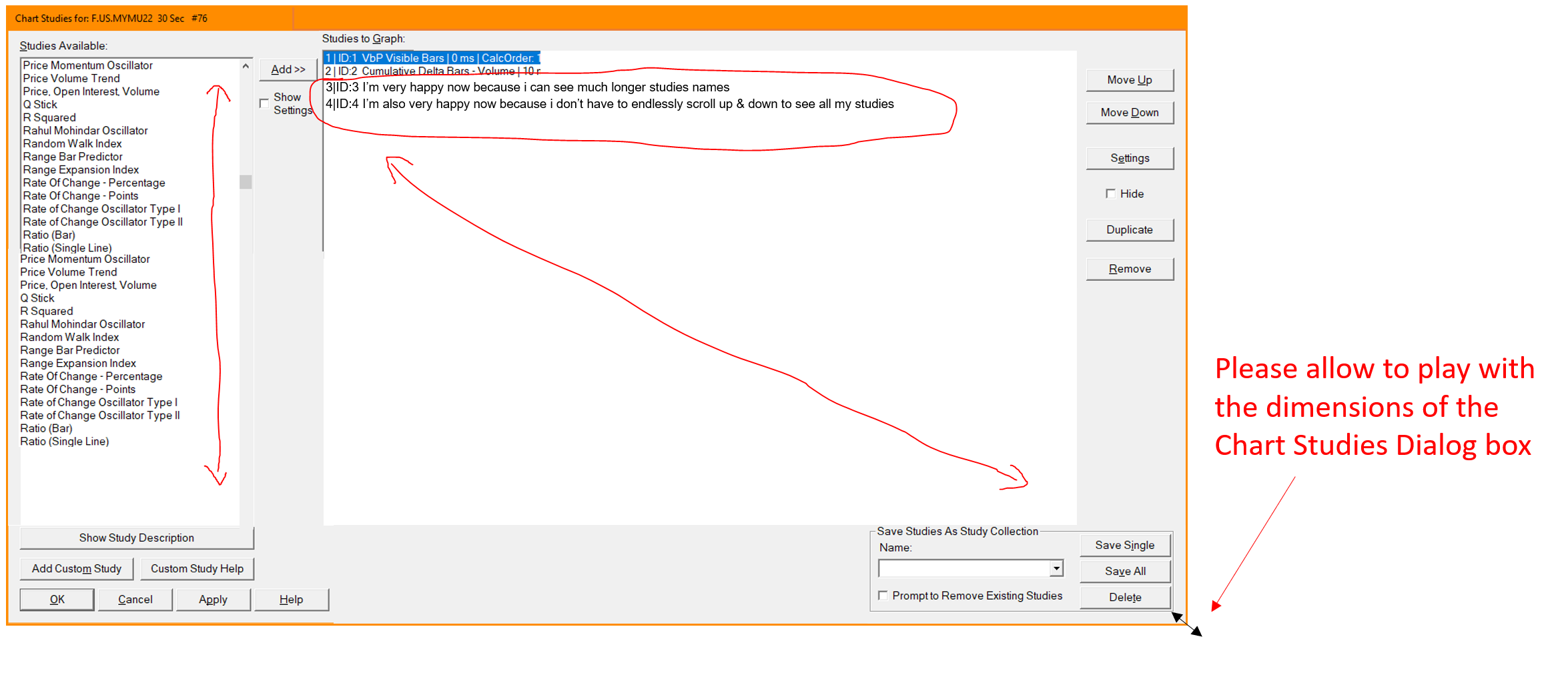 Please allow to play with the dimensions of the Chart Studies Dialog box