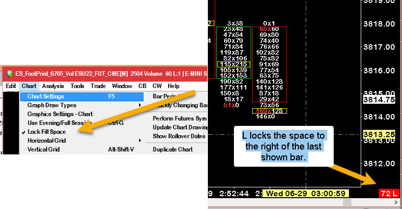 The control of the right space and the last shown bar is what SC calls "Fill Space". There is an option under Chart -> Lock Fill Space on the menu. If it is checked, then you will see an L in the bottom right of your chart. if you want to change the spacing after the last bar and the right of the chart, then uncheck the menu item, scroll the chart to the desired amount of empty space and then reset the lock option. IT is not a requirement that you use the lock option. There will only be a # if the lock option is not selected. Working With Charts: Scrolling The Chart and Right Side Fill Space Hope that helps. JohnR |