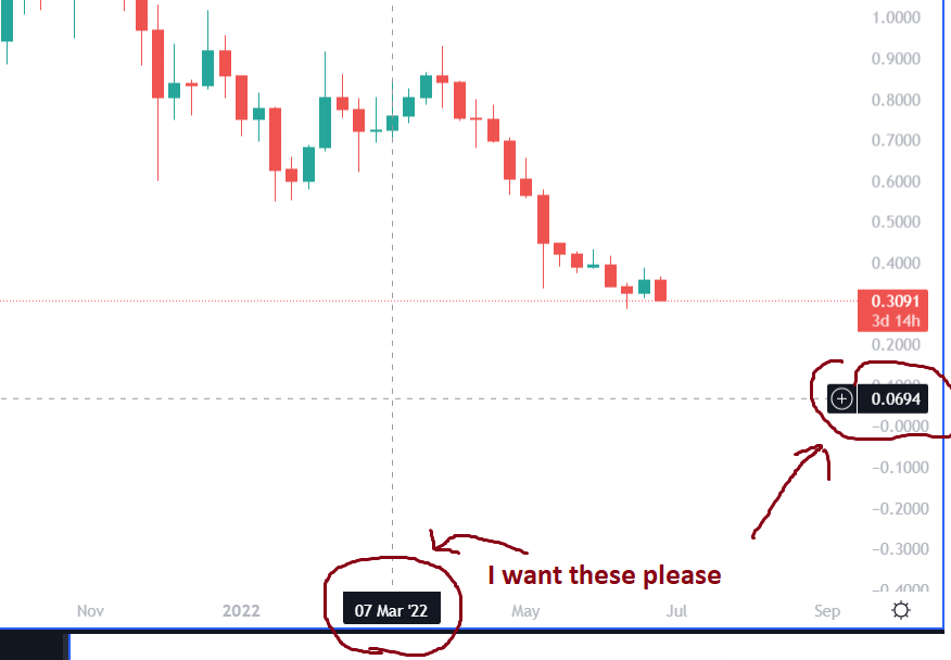 Dear Sierra Chart Engineers, I was wondering if you have this function. I'm sure you do, but I can't seem to find it anywhere... Similar to this picture from Tradingview, when hovering over the chart, where the crosshairs meet at the scales, there is a label showing the price and timeframe that you are hovering on. Can this be done in Sierra Charts? |