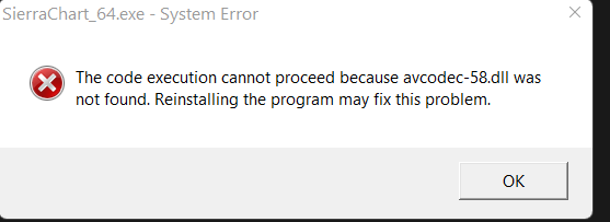 I am getting this error when installed latest pre release, 2410. The code execution cannot proceed because avcodec-58.dll was not found. Reinstalling the program may fix this problem> Reverting to previous version and sc works fine. Date Time Of Last Edit: 2022-07-01 16:40:34