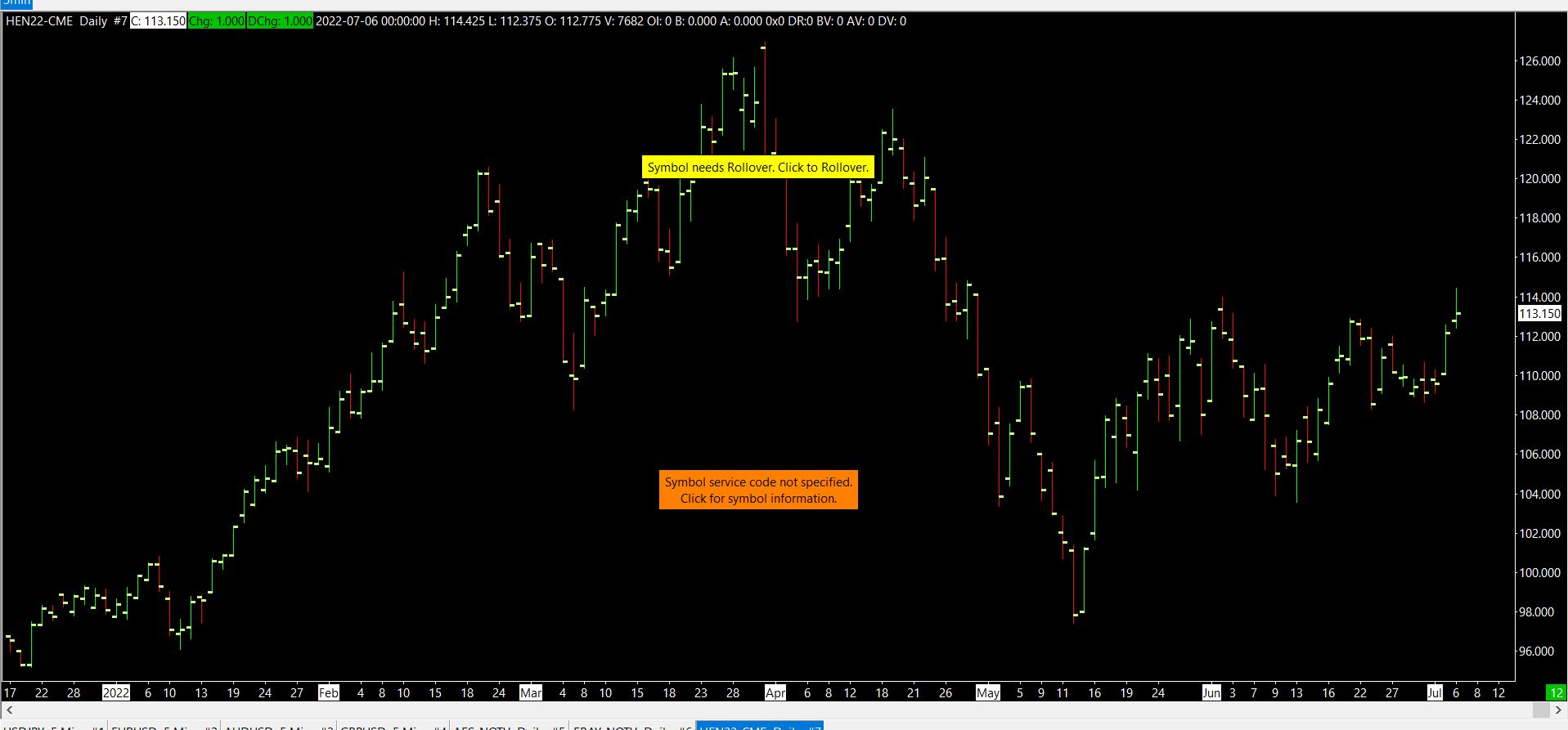 No this is definitely not true. The entire CME Group and CBOT symbols are available. What we see though is you apparently are using the direct FXCM FIX connection. This is very unusual and is not being used by any other user. Or at least very few users. The immediate solution to the problem is to install another copy of Sierra Chart for CME and EUREX symbols: Using Multiple Data and Trading Services at the Same Time And use the Delayed Exchange Data Feed: Delayed Exchange Data Feed Also, the symbol you are using HEN22 does actually have to be rolled over. That is a commodity futures contract. Sierra Chart Support - Engineering Level Your definitive source for support. Other responses are from users. Try to keep your questions brief and to the point. Be aware of support policy: https://www.sierrachart.com/index.php?l=PostingInformation.php#GeneralInformation For the most reliable, advanced, and zero cost futures order routing, *change* to the Teton service: Sierra Chart Teton Futures Order Routing Date Time Of Last Edit: 2022-07-07 11:43:37