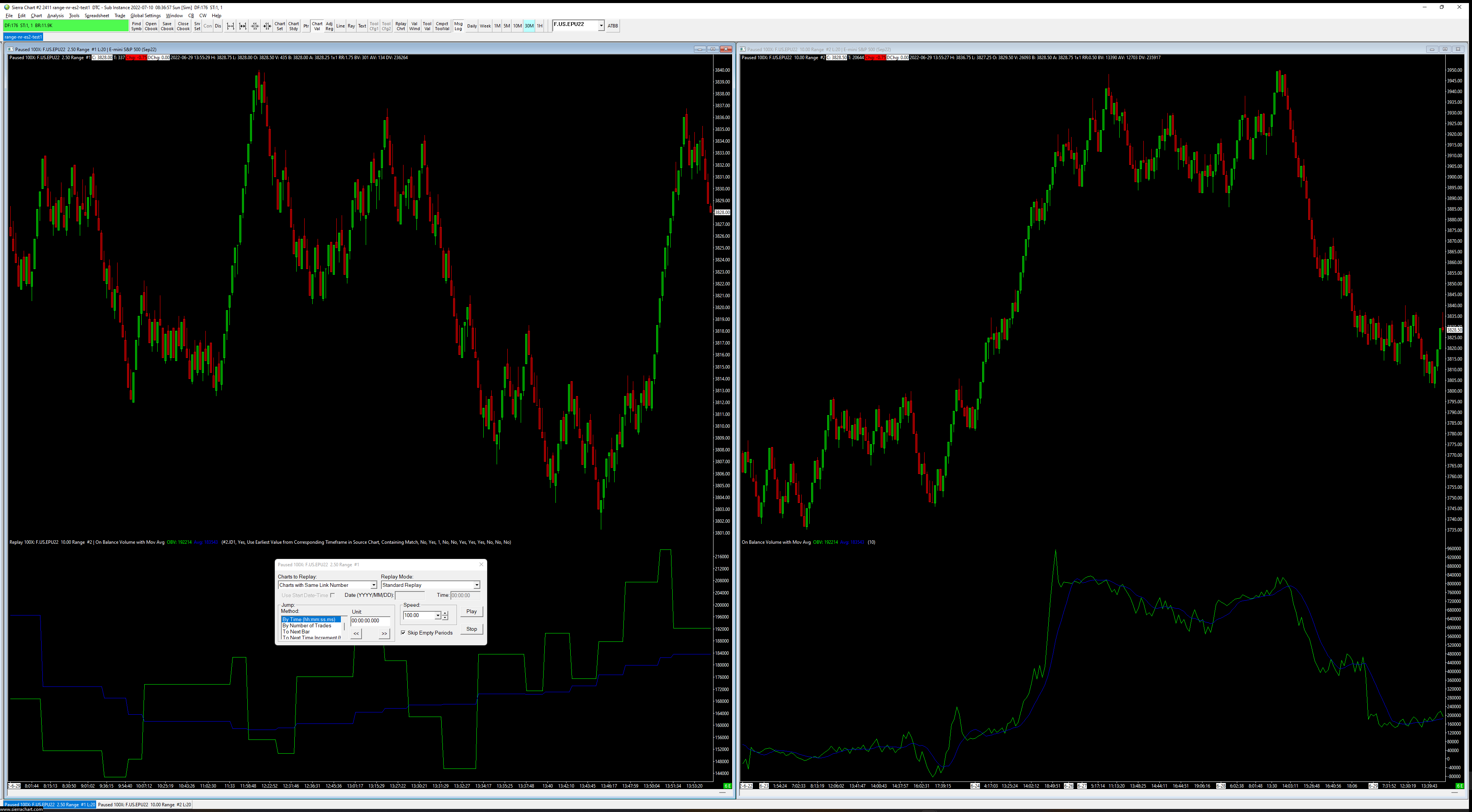 I am overlying OBV indicator with MA line from chrt2 to chart1, when I Replay the chart1 the OBV and the MA line are changing 2-3 bars back. Included 2 screenshots #1 is the replay chart, #2 is the same chartbook in another instance, for example on the Replay chart on 13:51:34 the OBV line is above the MA line, but on the other instance on same chart the OBV line is below MA line. I tested with changing the Data Copy Mode and Bar Time Matching Method, but still same issue. #1. https://www.sierrachart.com/image.php?Image=1657442218285.png #2. https://www.sierrachart.com/image.php?Image=1657442247393.png |