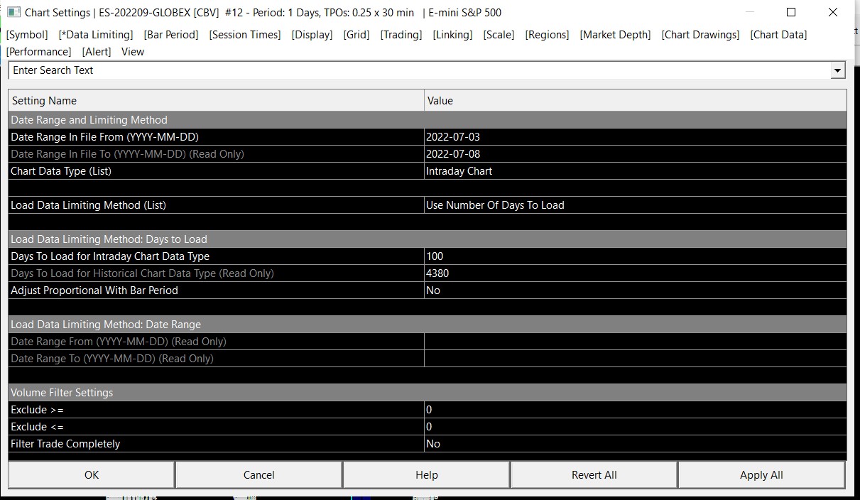Hello, i started using SC again this weekend and i opened my previous chartbook, updated to current ES contract and i found out that some charts are loading years of data, while some other charts are only loading 5 days of data. (I tried duplicating the chart that is loading years of data and do another study i.e market profile there but it gave me once more only 5 days. I looked it up in the TPO Chart settings but i couldn't find anything that would limit my data entries, and in any case i also have an hourly candlestick chart that is also loading only 5 days of data. I would need at least the TPO chart to go back a least one year back. Please see attached scrrenshots and i am sorry if this is a stupid question, i am still getting around the platform after not using it for a while. Thanks in advance. https://www.sierrachart.com/image.php?Image=1657484051287.png https://www.sierrachart.com/image.php?Image=1657484137809.png https://www.sierrachart.com/image.php?Image=1657484203815.png https://www.sierrachart.com/image.php?Image=1657484387129.png https://www.sierrachart.com/image.php?Image=1657484368705.png -it will not let me change the settings from intraday chart to historical chart for the market profile. https://www.sierrachart.com/image.php?Image=1657484519820.png i found this "Data limiting type to be activated from 03.08.2022, but it will not let me change the values. |