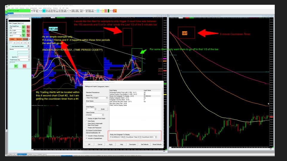 I would like some help of how to have a alerts fire off in a certain time of a 5 minute period but my Trading alerts are on a 4 second Chart. See Pics. I have and tried reading many support threads, and have not been able to figure out the coding or possibly the format for the time. I have used countdown timer on a 5 minute Chart that I then use or project on my 4 seconds Trading chart (see pic) using the “Text Display from Chart) I want my alerts to either fire off in the last ⅓ (100 seconds) for shorts , Or fire off in the first 100 seconds of a 5 minute period. On the 4 seconds chart, the count down timer text is ID21.SG1. So I thought I could just do a simple Alert AND(ID15.SG1<ID16.SG1, ID21.SG1<100, ID21.SG1>1) This does not work though. Should I use a different study to bring over the countdown timer, Different Format etc etc. AND(BARTIME>= TIME(17, 00, 00), BARTIME <= TIME(18, 00, 00)). |