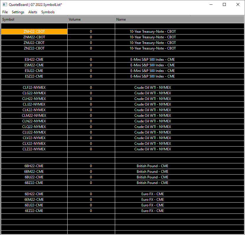Some of those will be zero because they are expired contracts. For the ones that are not expired, at this time you should be seeing nonzero values. Sierra Chart Support - Engineering Level Your definitive source for support. Other responses are from users. Try to keep your questions brief and to the point. Be aware of support policy: https://www.sierrachart.com/index.php?l=PostingInformation.php#GeneralInformation For the most reliable, advanced, and zero cost futures order routing, use the Teton service: Sierra Chart Teton Futures Order Routing Date Time Of Last Edit: 2022-07-22 07:44:13