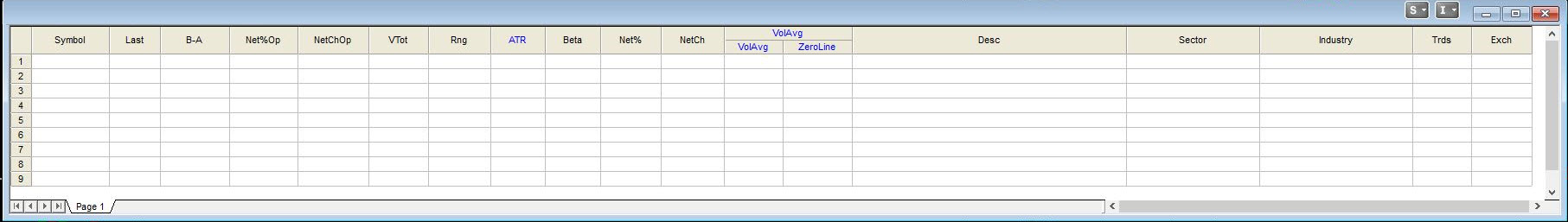 . - Ability to add new Column Titles - Symbol, Last Price, Bid / Ask Spread, Net % from Open, Net Change from Open, Volume Total, Range, ATR, Beta, Net % Change from Close, Net Change from Close, Average Volume, Description, Sector, Industry, Trades, Exchange |