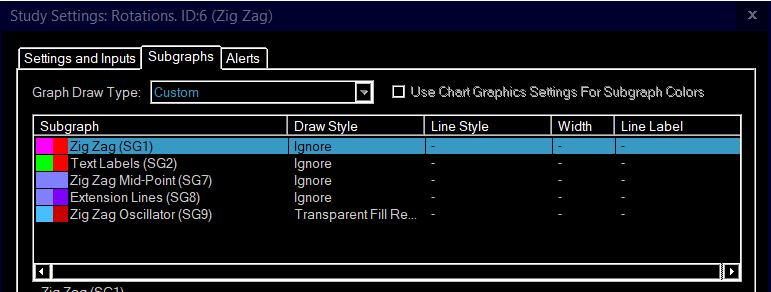 Hello, I was trying to configure the "Zig Zag" study similar to how someone else has there's set up. All the "settings and inputs" appear which I have configured. However, when I go into the subgraph settings it seems like I am missing some. I only have SG1-2, SG 7-9. SG 3-6 are not appearing. I included screenshots of both my settings screen and the one I am trying to replicate. Thank you, any help is appreciated. |