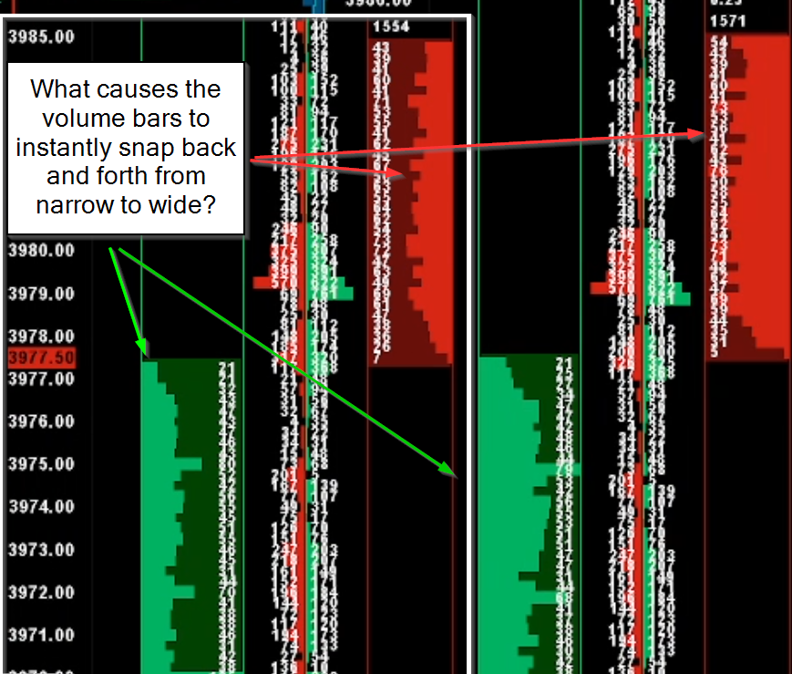 I have my DOM set up with "Bid Size/Buy Column" and "Ask Size/Sell Column" I also have the "Show Volume Bars" set to Auto. (See enclosed) For some reason, the volume bars expand, contract and expand quickly - without a significant change in the Bid or Ask amounts. What causes this fluctuation and how can I stabilize it? |