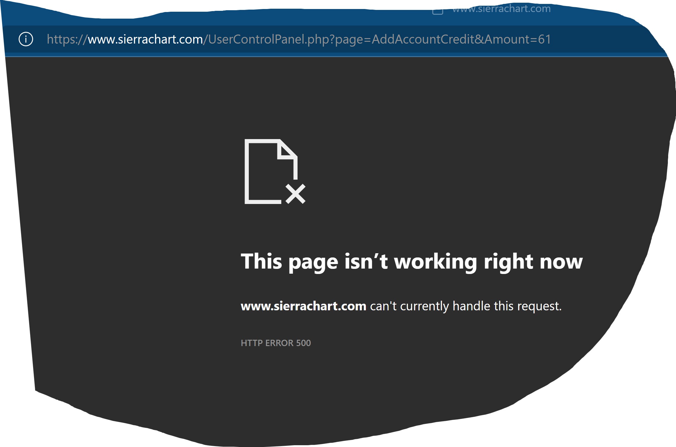 We will be looking into the problem today. Use Stripe if you can. We can give you temporary usage time extensions. Sierra Chart Support - Engineering Level Your definitive source for support. Other responses are from users. Try to keep your questions brief and to the point. Be aware of support policy: https://www.sierrachart.com/index.php?l=PostingInformation.php#GeneralInformation For the most reliable, advanced, and zero cost futures order routing, *change* to the Teton service: Sierra Chart Teton Futures Order Routing Date Time Of Last Edit: 2022-07-29 14:28:24