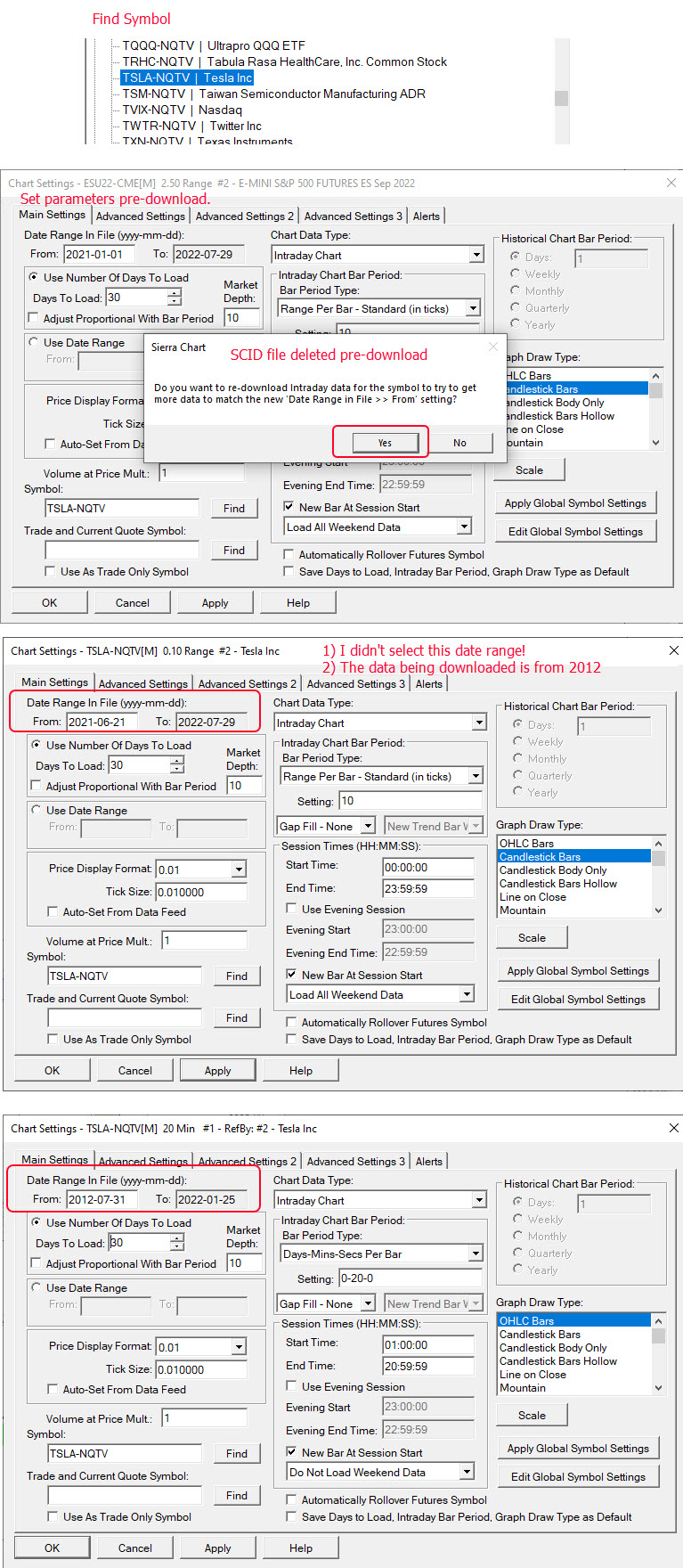 Dear Support I'd be grateful for your assistance with the following. I cannot seem to correctly limit or select, the correct data parameters for, in this example Tesla. I realise this is not my main platform (i.e., current SC version) but I cannot update this PC quite yet. At this time I have various RT data feeds from Sierra but I wanted to run over some Stocks. In this instance I am trying to download Tesla but no matter what I do it downloads different date parameters. Please see attached images. I'm sure it's something I'm doing but I've not had issues in the past. Many thanks. |