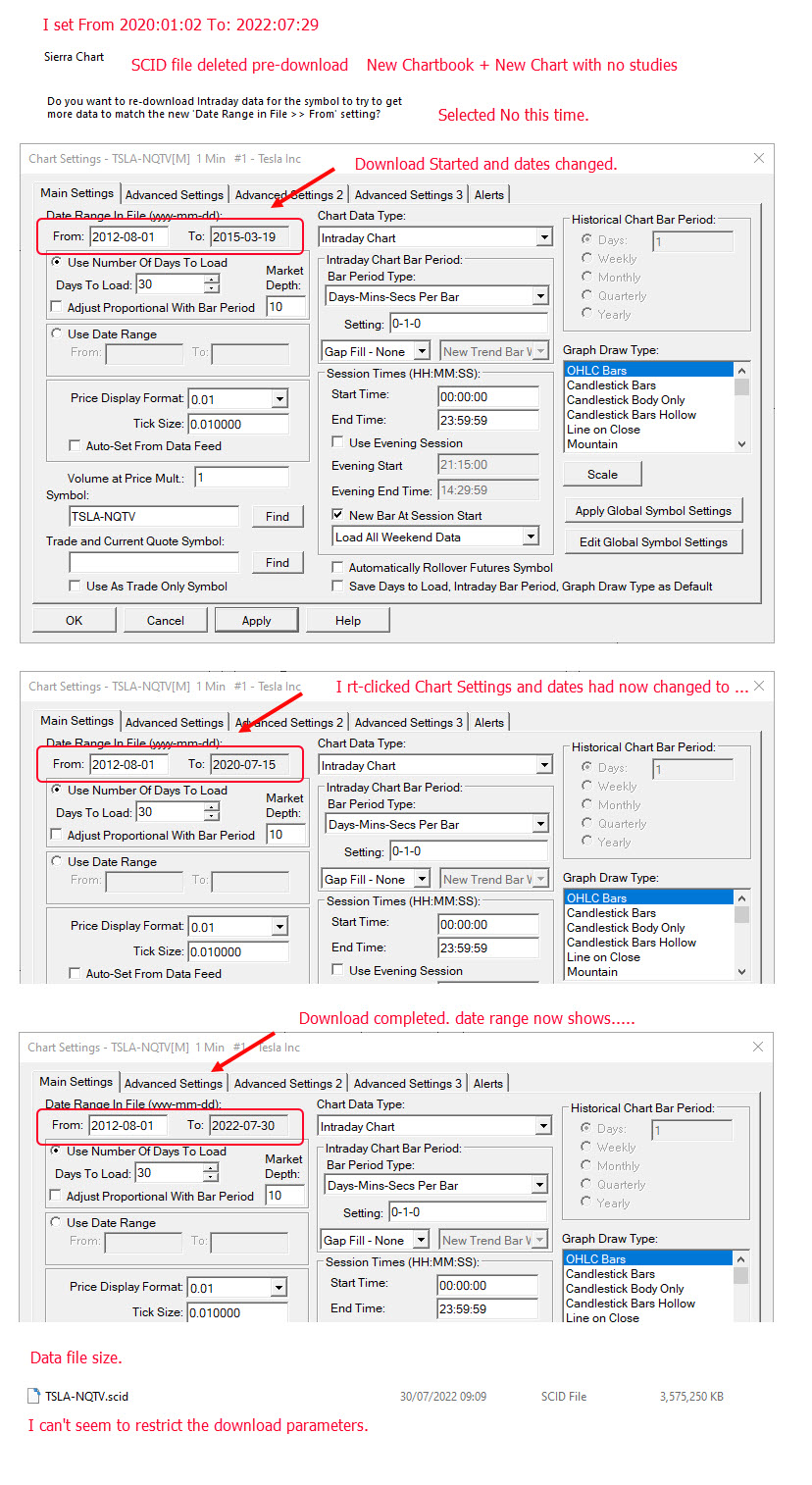 Do not provide any more screenshots. Those are just too confusing. We do not need the Chartbook either. The chart references are also irrelevant. Refer to: Historical Intraday Data (Missing Data / Download Errors / Viewing More Data): Downloading/Viewing More Historical Intraday Data If you want to limit the amount of data downloaded, refer to this particular setting: https://www.sierrachart.com/index.php?page=doc/DataSourceSettings.php#MaxHistoricalIntradayDaysToDownload Sierra Chart Support - Engineering Level Your definitive source for support. Other responses are from users. Try to keep your questions brief and to the point. Be aware of support policy: https://www.sierrachart.com/index.php?l=PostingInformation.php#GeneralInformation For the most reliable, advanced, and zero cost futures order routing, *change* to the Teton service: Sierra Chart Teton Futures Order Routing Date Time Of Last Edit: 2022-07-30 10:14:32