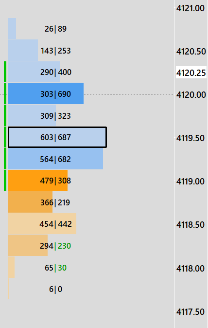 Hello, I am using Numbers Bars and am using "Background Coloring Based on AskVol BidVol Difference Percentage of Max Dominant Side", but its not working as intended and explained here: Numbers Bars: Background Coloring Based on AskVol BidVol Difference Percentage of Max Dominant Side The color range for both negative and positive Delta should be depending on the biggest Delta at a price in the whole candle. The way it does work for me is that it shows the color range seperate for positive and negative. So the highest negative Delta always has the color of range 3 Down and the highest positive Delta always has the color of range 3 Up. I attached a picture that shows you the problem. The biggest Delta at a price in the candle is at 4120 with a positive Delta of 387 (690 - 303). With my settings of percentage compare threshhold for Range 3 at 0.9 the negative Delta has to be at least -348 to be shown in the color of Range 3. Yet, while the biggest negative Delta in that candle is -171 (308-479) it is shown in the color of Range 3 Down. (You can see 3 more colors in that candle for Range 0,1,2 Down) Date Time Of Last Edit: 2022-07-31 21:26:17