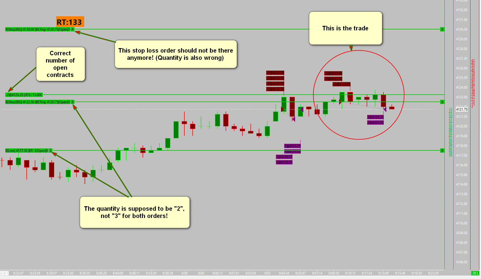 Dear SC Support Team, I have been using your trade copier for quite a while now, and it has been a good experience (apart from some things I would like to have added concerning contract distribution and adjusting TP order locations...but that's a different story.) But today (after downloading the current SC version 2419 (I don't know if that has anything to do with it)) something odd happened in the chart/the account I copied a trade to: I copied with factor 2 ("Allocation Trade Account Multiplier") from the original chart. 4 contracts were filled on the initial entry and then 2 more were scaled in on one occasion, so I ended up with 6 MES contracts in the chart/account that had the issue. So far so good. After 4 ticks of profit were reached (the first target), 4 of those 6 contracts got filled and the stop loss of the remaining 2 contracts was supposed to be moved to break even +1. In the orginal chart that worked fine (just with fewer contracts); however, in the chart of the account I copied the trade to I was pretty surprised to see that the SL had moved to BE+1 (based on average entry price), BUT there was still another SL order present at the original location (30 ticks above the initial entry price). PLUS, the contract quantities were totally wrong everywhere! There were only two open contracts remaining, so, there should have been a quantity of 2 in the (proper) SL order and also in the limit order at the next profit target. However, there were 4 contracts sitting at the "original" SL position, 3 contracts at the moved "BE+1 SL", and 3 contracts at the limit order at the next target! I had to quickly change the quantities manually! I attached a screenshot with annotations to illustrate the issue. (In an earlier trade this morning (no scale-in; all 4 contracts filled at once) some weird "phantom" SL had also remained in the original position in the chart; so it was not a "one-time" problem.) Bottom line: It was completely messed up. I have not changed any settings compared to Friday, the only difference (apart from having used SC version SC 2417 back then) being that I copied the trade to another account (setting that one up in the "Order Allocation" Window accordingly) and using factor 2 as the "Allocation Trade Account Multiplier" in that one (the other one was using "1"; maybe that factor 2 plays a role in the problem? Or the scaling-in?). Do you have any explanation for this occurrence? Is there maybe a bug in SC release 2419? This issue is rather worrying (I'm using the copier to copy trades between evaluation accounts), so I hope we can sort it out soon. Thank you very much in advance for your effort and feedback. |