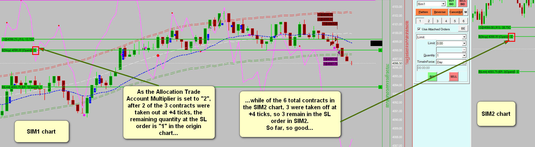 Hello, as a follow-up: I took another SIM trade with scaling-in and copying the trade from SIM1 to SIM2 (multiplier 2) today. And while I could not reproduce the exact same issue described in my initial post, there was still an issue with wrong quantities after I moved the SL in the origin chart manually to lock in more profit after the 1st TP at +4 ticks had been hit earlier. (The prior automatic movement of the SL to BE+1 did not have that effect.) As soon as I moved the SL manually in the origin chart, the SL location was also changed in the SIM2 account... BUT, instead of keeping the correct former quantity of 3 contracts being protected by the SL, the quantity was reduced by 1, so that only 2 contracts were left protected! After another manual move down of the SL, when it eventually got hit, I therefore ended up with one contract still remaining open, but being unprotected now (no more stop loss in place)! So, something is obviously wrong with the SC trade copier. It seems that multiplying the traded contracts by means of the "Allocation Trade Account Multiplier" leads to several problems. (I have never had similar issues so far in accounts to which I copied using multiplier "1".) I attached three pictures, which show how the SL contract quantity got changed and the unprotected remaining contract in SIM2. Again, thank you for looking into it. Date Time Of Last Edit: 2022-08-02 10:08:15