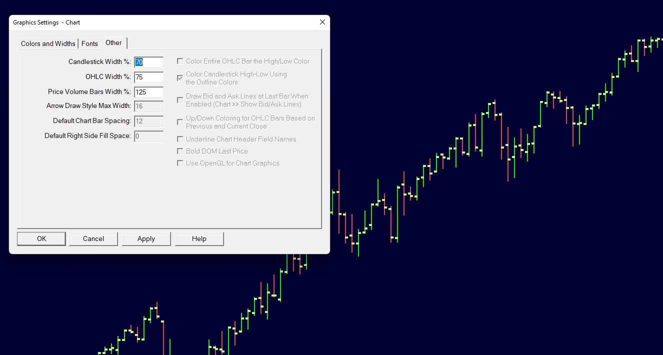All the right-side checkbox options in the "Other" tab of my Chart Graphics Settings dialog are disabled. I'm using OHLC bars, and have unchecked "Use Global Graphics Settings". What do I need to do to enable the disabled options in the "Other" tab panel? See attached screenshot for a visual. THankS! |