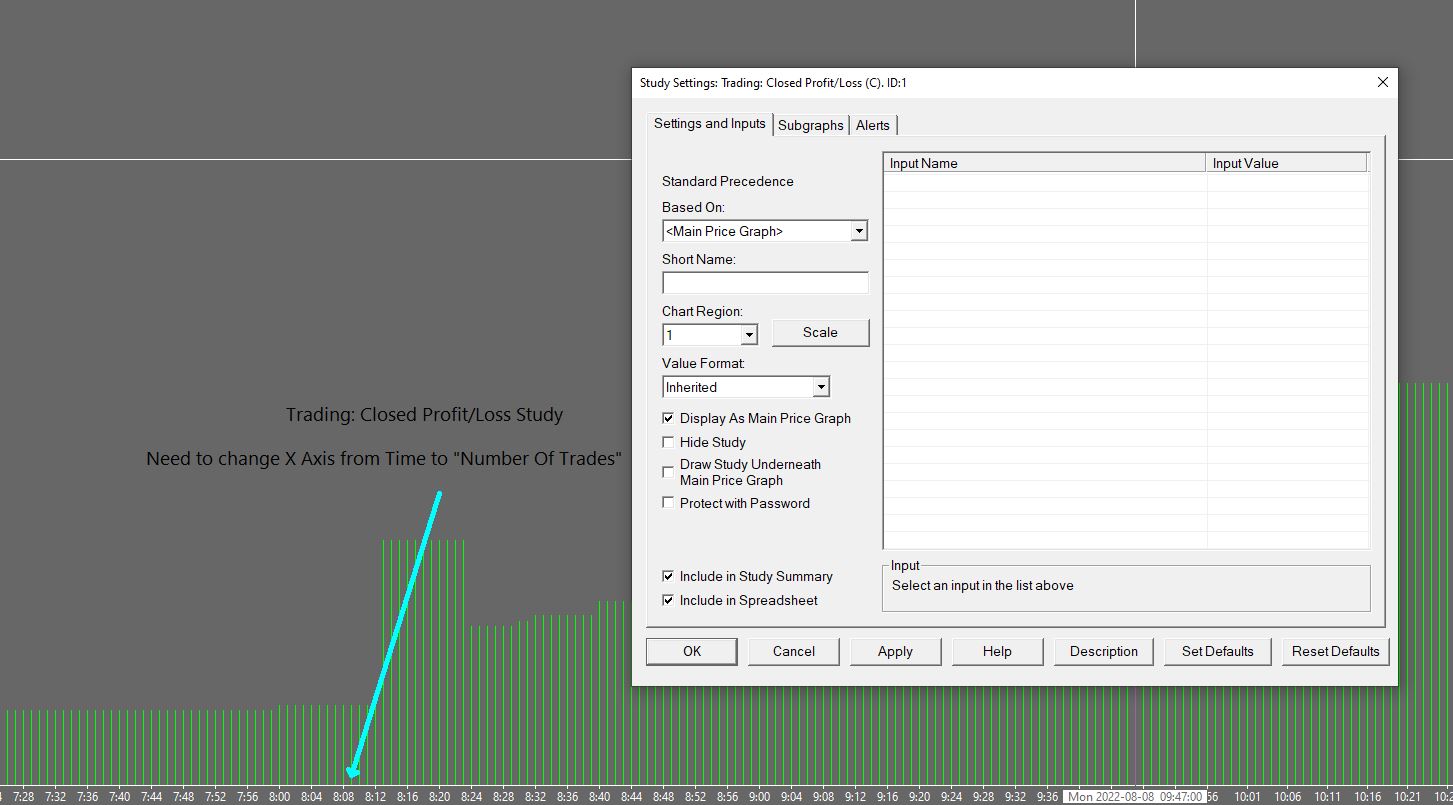 Hello, I am using the Trading: Closed Profit/Loss study and made it the main graph. However, I am unable to change the X axis to view the number of trades, instead, it shows only the time on X axis. Is there a way I can change the X Axis to display number of trades for this study. Thank You, |