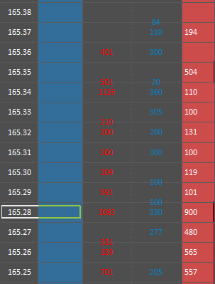 From left to right: Price, Buy Column, Recent Trades at the Bid Column, Recent Trades at the Ask Column, Ask Column. Problem exists within the Recent trades columns.