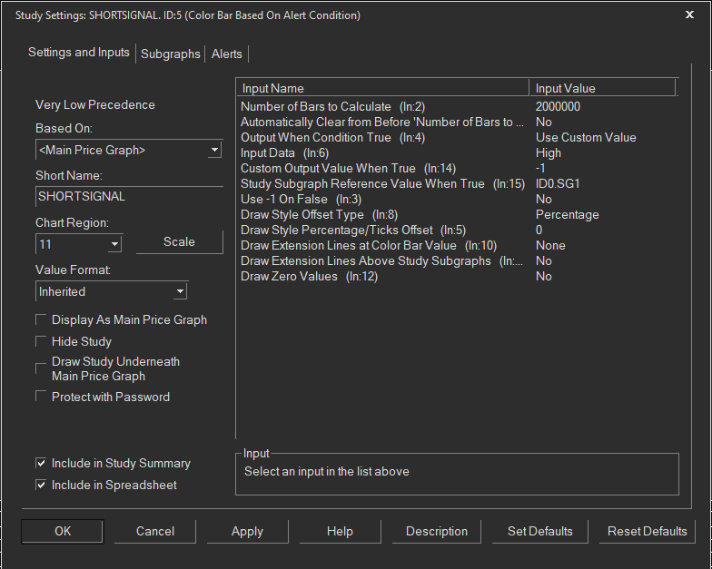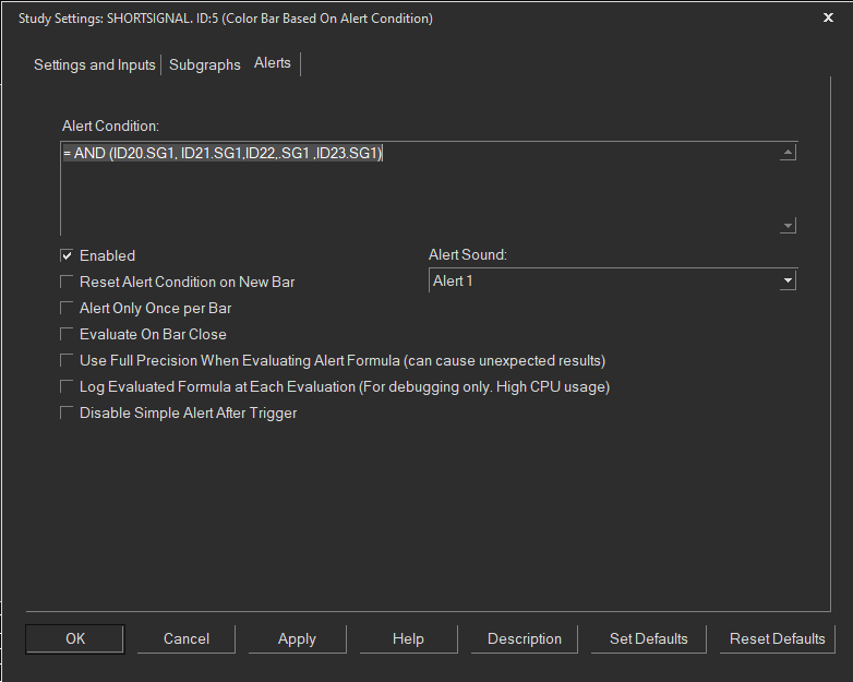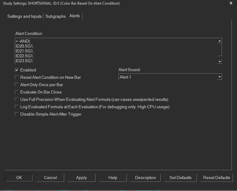 I was successful in creating an alert condition from different charts which I aggregated using the study overlay and a Color Based Condition study with positive values: =AND (ID1.SG1, ID9.SG1, ID10.SG1, ID11.SG10) for the negative values I use the same process and I changed the following inputs: Output When Condition True: Use Custom Value / Custom Output Value When True: -1. I get this error: Formula references unknown study. How can I solve this issue? |