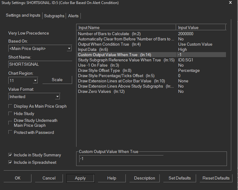 First, it looks like you are missing a closing parenthesis at the end of the your Alert Formula, which we think is why you are getting a formula error. Second, if you want the output to be -1 when the alert is true and you have the setting for Custom Output Value When True set to -1, then remove the negative sign from your Alert condition. See if that resolves it. For the most reliable, advanced, and zero cost futures order routing, use the Teton service: Sierra Chart Teton Futures Order Routing |