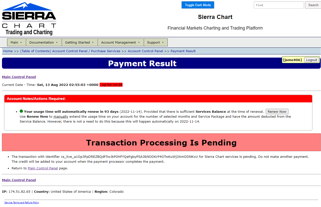 I added funds to usage time as normal and received a message saying "transaction processing is pending" and do not make another payment. This was done on Friday 8/12. Also during this transaction I switched from package 5 to package 11 with the denali feed. I will need to add more funds to accommodate the length of time selected but do I need to wait for this message to be sorted out? As of the Sunday market open I am not receiving data. Thanks |