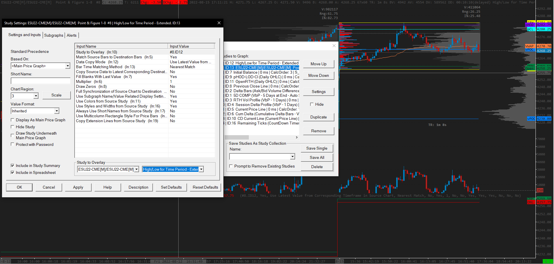 Hello, I have been trying to track the ONH and ONL on some RTH charts. I followed all the instructions explained on Sierra but as you can see on the picture attached, the study appears on the bottom of the screen, and not on the chart where I want it to appear. How can I change this? Thank you |