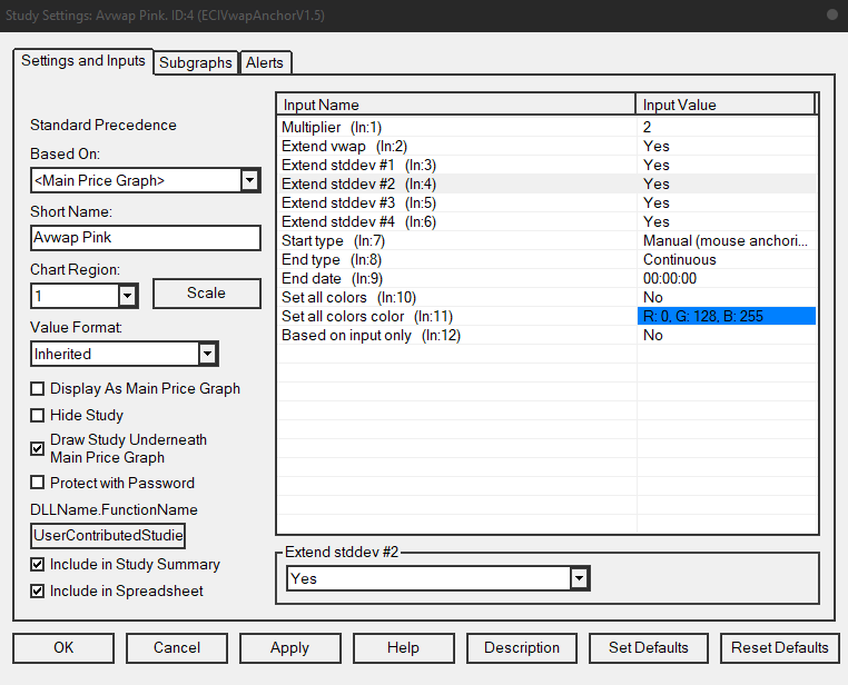 That is not a Sierra Chart study, so we can not help you with that study. The built-in Volume Weighted Average Price allows you to set Standard Deviation bands at any multiplier. Refer to the information here: Volume Weighted Average Price (VWAP) with Standard Deviation Lines For the most reliable, advanced, and zero cost futures order routing, use the Teton service: Sierra Chart Teton Futures Order Routing |