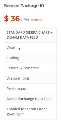 Or go to this page: https://www.sierrachart.com/UserControlPanel.php?page=ServicesActivation You will need to login if you are not currently logged in. In the "Available Services >> Choose Usage Time Service Package" frame, select the Service Package that you want to set your account to. Press the "Set" button. The remaining service usage time on your account will be adjusted based upon the cost of the package you are changing to. If the new package is a higher-priced package, then the usage time will be reduced due to the higher price. There is no charge for changing your Sierra Chart service package. Only your Sierra Chart account usage time ending date is adjusted. When changing between Sierra Chart Service Packages, the usage time ending date on your Sierra Chart account is adjusted based upon the price differences between the package you are changing from and the package you are changing to. When changing to a higher priced package, your usage time ending date will be brought back closer in time. When changing to a lower-priced package, your usage time ending date will be brought forward further out in time. The only additional cost over and above the package cost, is the cost for the exchange(s) for which you need data. This can range from $1.50 to $33.00 for the CME Group data, depending on what exchanges within the CME Group you need and whether or not you need Market Depth data. When you go through the Setup Instructions for the Teton Order Routing Service, you will setup the Denali Exchange Data feed at Step #5. You will find the setup instructions here: Sierra Chart Teton Futures Order Routing: Setup Instructions For the most reliable, advanced, and zero cost futures order routing, use the Teton service: Sierra Chart Teton Futures Order Routing |
