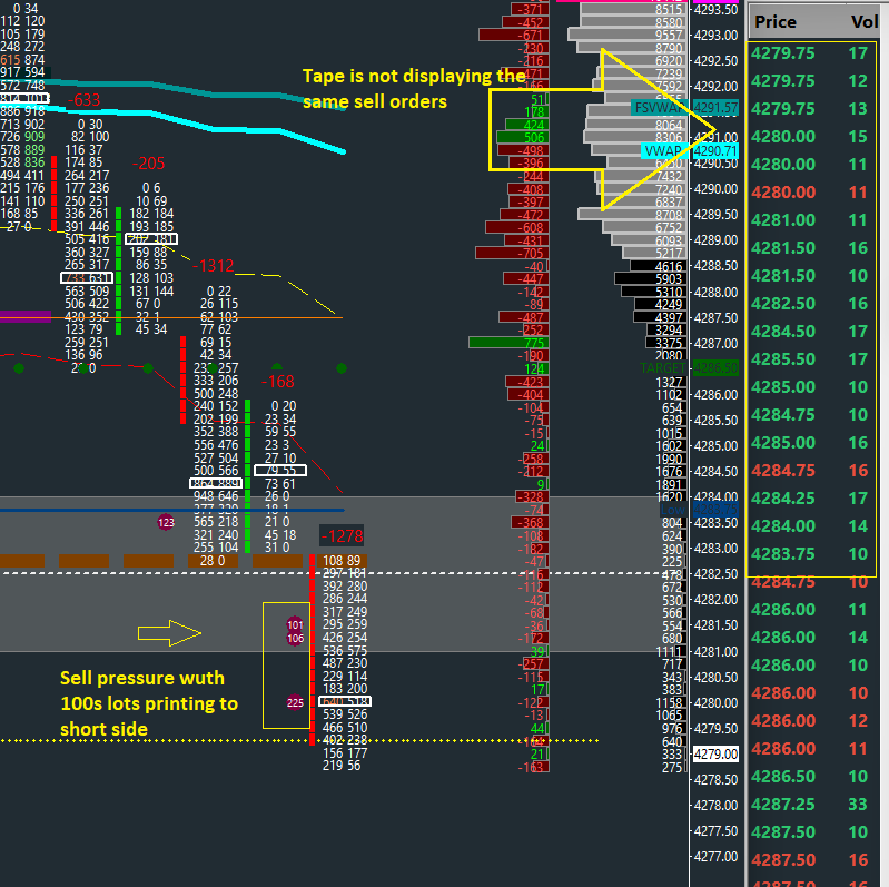 I have a footprint chart and a tape along each other, but it looks like the tape is not displaying accurate informations. Whenever there is a sell pressure for example and the footprint chart shows 100s lot printing, the tape does not translate the same image. I attached an example in the attachment below Note: I set up the tape to DO NOT COMBINE option with a filter to show 10 lots and above. |