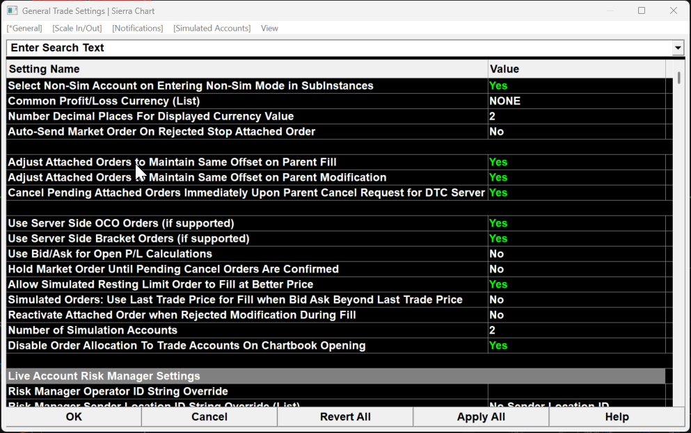 The image you show is from the "General Trade Settings". The setting referenced in Post #2 is in the "Trade >> Chart Trade Settings". Note that the information for where the setting is located is in parentheses in the documentation for each setting. Refer to the following: Global Trade Settings Windows: Maintain Same Offset Between Target and Stop Attached Orders (Global Settings >> Chart Trade Settings >> General >> Order Modifications) Although we do see that that specific setting was marked incorrectly. We have fixed this in the documentation. For the most reliable, advanced, and zero cost futures order routing, use the Teton service: Sierra Chart Teton Futures Order Routing |