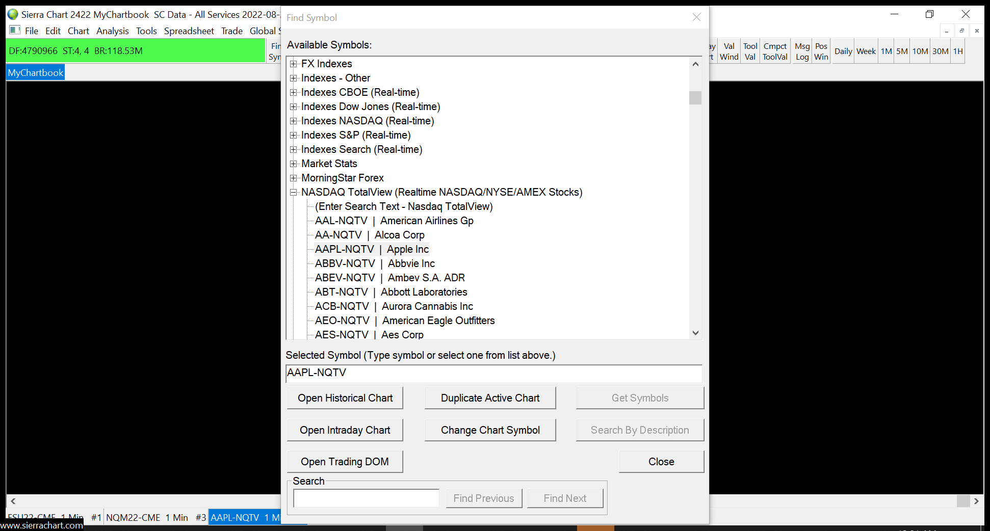 Hi Team, I am new user, just joined sierra charts and I use it mainly for charting. The issue I am facing is that I am not able to load Intraday charts like 1 min, 5 min etc for NASDAQ stocks. After the message that historical data load is complete nothing comes up for intraday, it's just a blank screen that I get. If i switch to 1 day then I could see data. I read some of the help document and followed steps like updating the symbol settings etc. I am selecting the symbol ending with NQTV like APPL.NQTV etc The same works fine for futures and I am able to see data for ES, NQ. FYI I have subscribed to NASDAQ market data. So I need support team to help me on this. Thanks Date Time Of Last Edit: 2022-08-19 09:01:42