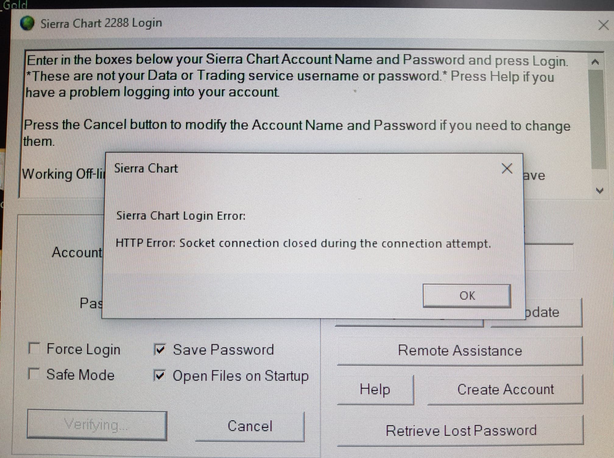 You are able to log into the Sierra Chart website if you posted this message. So you do not have a problem with this. Can you provide a screenshot of what you see at the Sierra Chart Login window when you try to login. Instructions to attach: Support Board Posting Information: Attaching a File (Optional) Also refer to: HTTP Communication Errors Sierra Chart Support - Engineering Level Your definitive source for support. Other responses are from users. Try to keep your questions brief and to the point. Be aware of support policy: https://www.sierrachart.com/index.php?l=PostingInformation.php#GeneralInformation For the most reliable, advanced, and zero cost futures order routing, use the Teton service: Sierra Chart Teton Futures Order Routing Date Time Of Last Edit: 2022-08-25 11:49:43