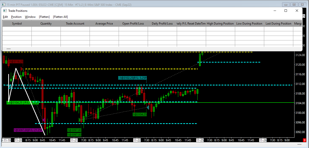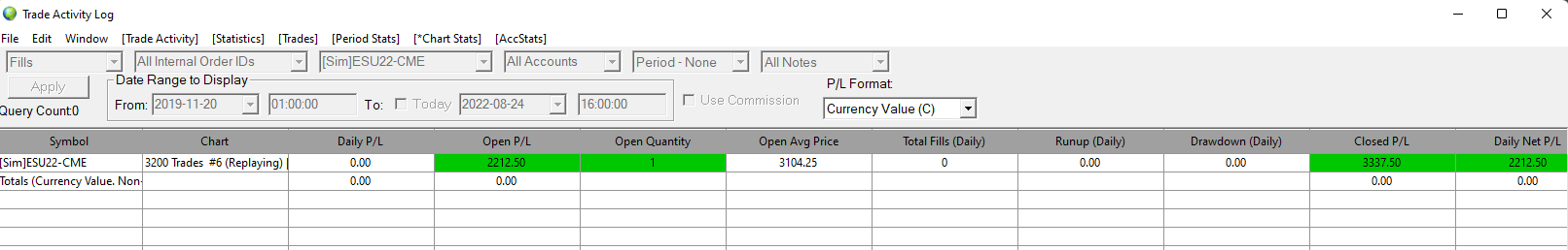 Hi, was backtesting swing trading and have an open order on ES for simulated trading. When I closed sierra chart and tried to continue back to where I was, I noticed I cannot edit the position nor see it on my trade positions window. However, the position is still open (3104.25). Any idea how I can edit the trade again or do I have to basically jump back and redo the entire trade/replay over? Can I edit an OCO order onto it? I can see it's open in the trade log though. Date Time Of Last Edit: 2022-08-27 17:10:44
