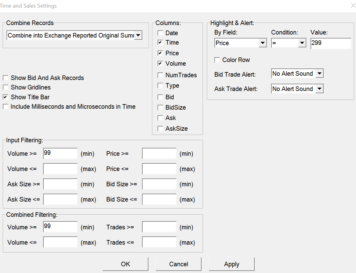 You would want to keep the 99 for the "Input Filtering >= (min)". The reason for this is that the Combined Filtering only filters out those trades that have been combined. Therefore, if you want to filter out all trades (combined or not) that are less than 99, then you would want to have both those fields filled out. This should work. Be sure that after you make the change and have your filtering set as you want, that you Clear the Time and Sales window to ensure that you are not seeing data from before you made the change to the filters. The information for the filters in the Time and Sales can be found here: Time and Sales Window: Time and Sales Settings For the most reliable, advanced, and zero cost futures order routing, use the Teton service: Sierra Chart Teton Futures Order Routing |