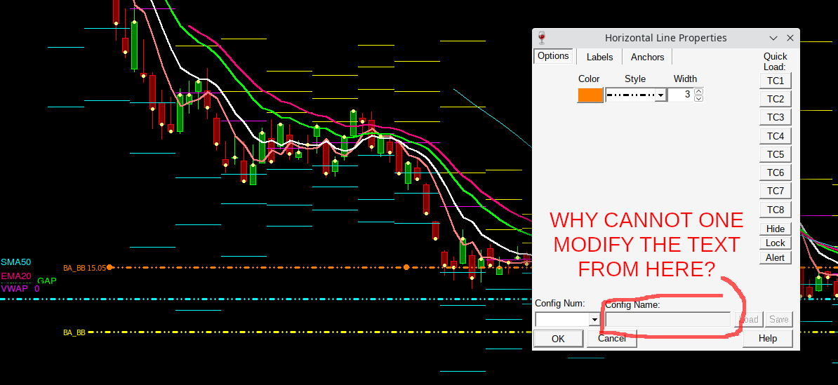 Hello, I'd like to suggest you some improvements that would allow the users to save time and distress: 1) Window menu bar fonts and Alert Manager fonts (please see images SC1_window_menu_bar.png and SC2_alert_manager.png): I pledge you for mercy. The current fonts are suitable for who are in their 20s. Who are in their 30s and 40s may begin to have some eyesight problems. And I'm 60 and already wear glasses. Please use bigger or more readable fonts, or allow the user to set them as necessary. 2) Alert Manager (please see image SC2_alert_manager.png): 2.a) The "Delete" command doesn't prevent the user to delete an entry accidentally. A confirmation request would be appropriate. 2.b) The user cannot save their preferred column widths. 2.c) Enabling an alert again, it still shows as "triggered". It seems not to reset. 3) Add Symbol Alert (please see image SC3_add_symbol_alert.png): A value deviation in percentage (e.g. above <value> +0.1% or below <value> -0.1%) would be appreciated. At present the user has to calculate it separately. 4) Horizontal Line Properties (please see image SC4_horizontal_line_properties.png) and similar tools: 4.a) The user cannot modify either the color and the text using the same command, but is forced to do two separate tasks for the same item. 4.b) The user cannot select multiple tools to set the same modifications to all selection. 4.c) A "copy properties" command would be very appreciated. 5) Save Chartbook (please see image SC5_save_chartbook.png): 5.a) All the "Chartbook" windows should be resizable to avoid a continuous mouse dragging. 5.b) The File Name should show highlighted for the same reason. 5.c) All the "Chartbook" windows should have the "Search" field. Please consider who have to do the same tasks repeatedly. Many thanks. Date Time Of Last Edit: 2022-09-01 09:37:53