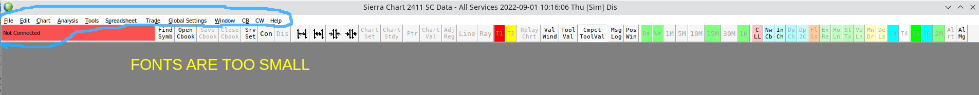1. These are operating system controlled fonts. You need to change these through the Windows operating system. Sierra Chart does not control these particular fonts at all. And all other fonts in Sierra Chart are controllable unlike other programs in the world. Sierra Chart is the only program in the world, that let's you control all font sizes: Graphics Settings: Fonts and Text Appearance And the new settings windows, also let you control fonts and all the old dialog windows are being converted to the new settings windows. Sierra Chart Support - Engineering Level Your definitive source for support. Other responses are from users. Try to keep your questions brief and to the point. Be aware of support policy: https://www.sierrachart.com/index.php?l=PostingInformation.php#GeneralInformation For the most reliable, advanced, and zero cost futures order routing, use the Teton service: Sierra Chart Teton Futures Order Routing |