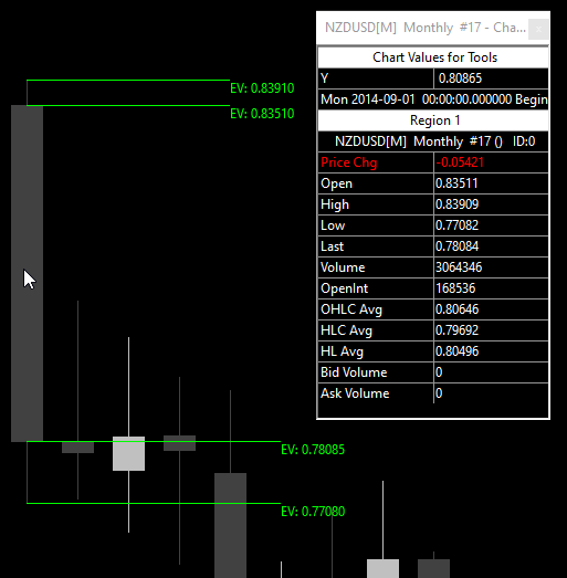 Right, just noted that what you suggested DOES give highs, lows etc ....but it's so far away (below the menu and tabs and in grey) that a) I hadn't noticed it before and just saw it by pure fluke and b) it's incredibly inconvenient. At least I can see what the values are now, albeit takes my eyes away from the bars. It's incredible that nobody else finds that a problem ...surely you want a box to pop up really close to a bar, on request. Love the software, but fear it's a deal breaker. Shame. |